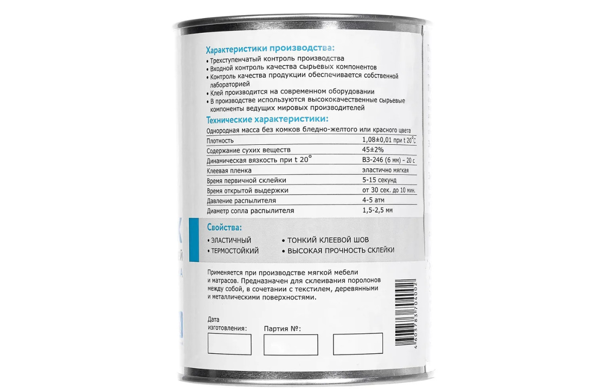 Описание Клей мебельный SinTex MF red (1 кг.) эластичный, термостойкий, тонкий клеевой шов, высокая прочность склейки. Применяется при производстве мягкой мебели. Предназначен для склеивания поролонов между собой, так и в сочетании с текстилем, деревянными и металлическими поверхностями. Состав: негорючий растворитель и синтетические каучуки. Масса: 1 кг Содержание сухих веществ: 44±2% Клеевая пленка: эластично мягкая Время первичной склейки: 7-12 секунд Время открытой выдержки: от 2 до 10 мин