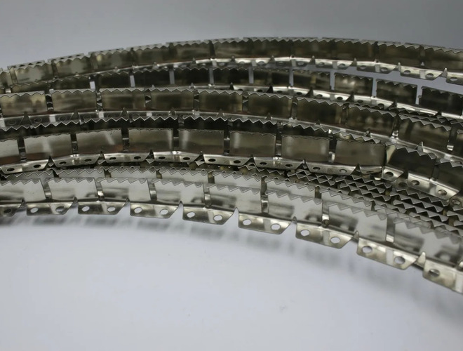 Описание Мы уже привыкли, что для обивки мягкой мебели чаще всего используется мебельный степплер. Именно с его помощью создается наиболее надежное крепление ткани и наполнителя к жестким деталям. Однако на лицевых поверхностях такой шов будет выглядеть не вполне эстетично. Выход есть – использование ленты для потайного шва. Это металлическая зубчатая конструкция крепится к жесткой детали, а затем на нее натягивается материал. В дальнейшем зубчики зажимаются и материал плотно закрепляется без видимого соединения. Другими словами, вы имеете ровный красивый шов без ниток и скоб, идеальный для лицевых поверхностей. Именно так работает лента потайного шва, избавляя вас от необходимости формирования красивого соединения при помощи швов и ниток. Мы предлагаем высококачественную металлическую ленту потайного шва повышенной прочности, но при этом достаточно гибкую и износостойкую.